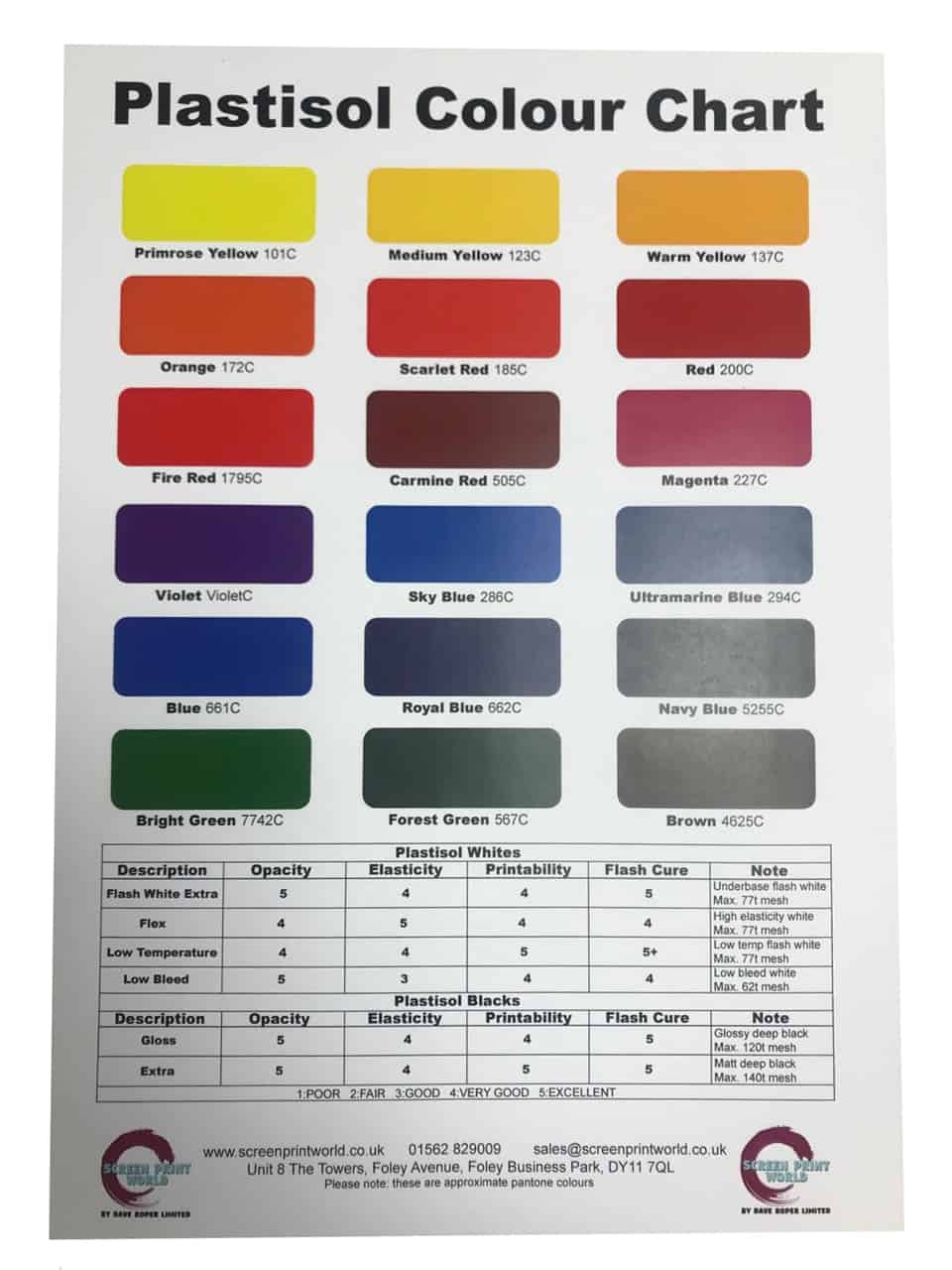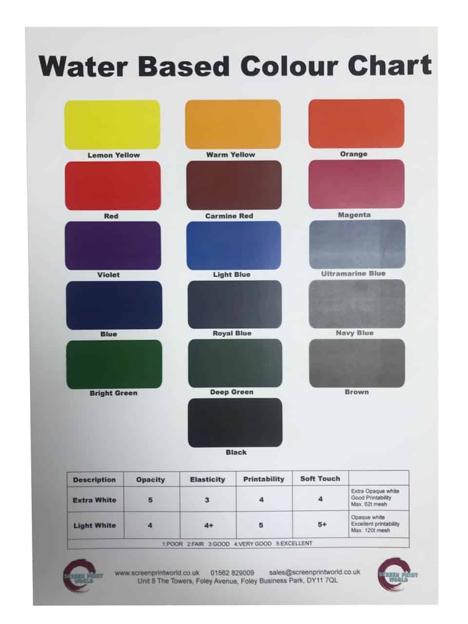 Includes Plastisol and water based ink colours. Waterbased and Plastisol.