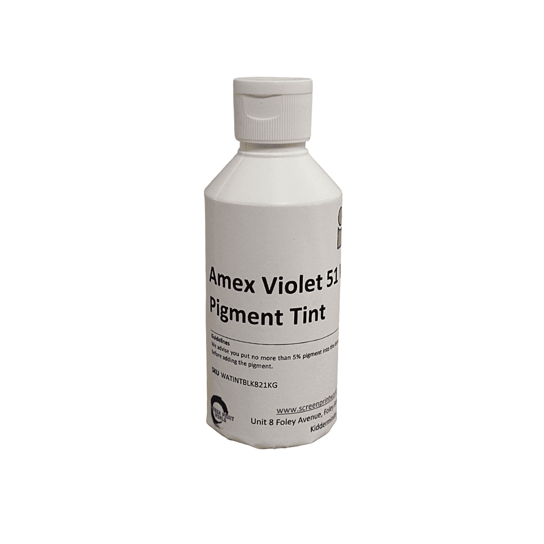Amex Pigments are waterbased concentrated pigment tints that can be mixed with waterbased transparent and opaque bases, including discharge base. The produce Bright colours which are very similar to our pre-mixed waterbased and plastisol ranges. PVC, Phthalate, formaldehyde and heavy metal free. Shake the pigments well before use. Pigments should be added in certain percentage between 3% and 10 % according to different bases. Available in 250ml and 1l