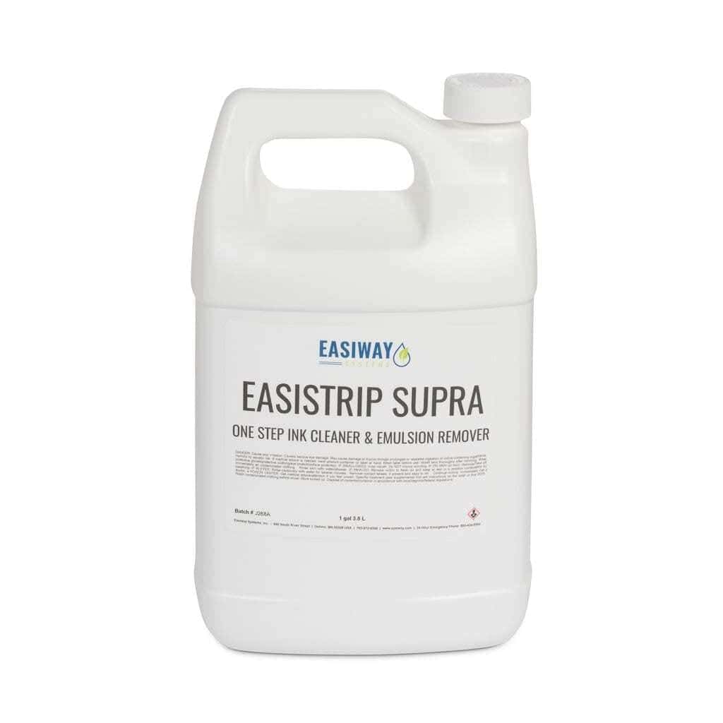 EasiStrip Supra One Step Ink Cleaner & Emulsion Remover is designed to dissolve plastisol inks and remove emulsion from the screen printing mesh-at the same time. This product is for use in a dip tank for superior time and chemical savings. EasiStrip Supra is an ultra- concentrated liquid and designed to be mixed with water 1:7 while remaining homogenous. With EasiStrip SUPRA, textile screens can be cleaned for pennies by combining many of the cleaning processes into one.  EasiStrip SUPRA is a zero VOC, low odor, non-flammable, non-hazardous product which will provide the benefits of less labor, less expense and improved efficiency to the screen cleaning and reclaiming operation. This concentrated one step ink & emulsion remover is designed to be used as part of the Easiway dip tank system.