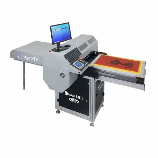 The i-Image STE II expands the capabilities of M&R’s i-Image STE, the world’s first all-in-one computer-to-screen (CTS) imaging and UV LED exposure system (patents pending). Both combine imaging and exposure in one machine, dramatically reducing the time and effort required to prepare images for screen printing. On the inward pass, they use specially-formulated water-based UV-blocking ink and advanced high-resolution inkjet printer technology to quickly generate opaque images on emulsion-coated screens.