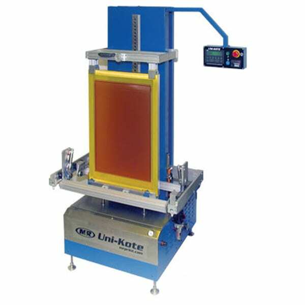 M&R UNI-KOTE Automatic Screen Coating Machine Uni-Kote provides a reliable, low-cost option for automating screen coating. The computerized control center, conveniently mounted at the side of the screen coating machine, makes programming simple. Uni-Kote’s front and rear screen coaters can apply emulsion in tandem or independently, allowing operators to coat each side of the screen separately, both sides simultaneously, or just one side. M&R’s Job Recall™ allows users to save up to five screen coating jobs for added convenience and quick changeover.