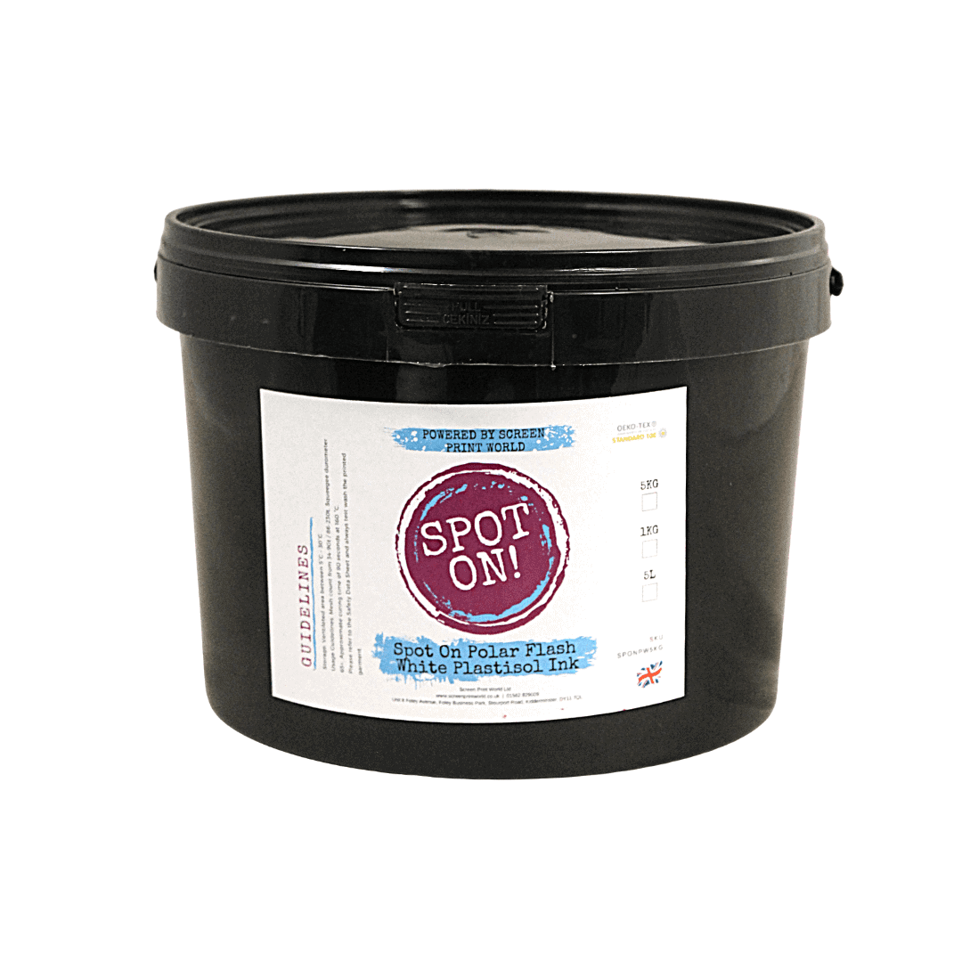 Spot on Polar Flash White Plastisol is a very affordable press ready ink, available in 1kg and 5kg tubs. Spot on plastisol inks are phthalate and heavy metal free and offer a soft feel and good elasticity once cured. They have a great mixing consistency and are super opaque and perfect for printing onto dark garments. These inks are suitable for manual or automatic printing.