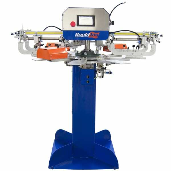 Multi-headed machine for three colour printing, normally used for printing on tote bags or sleeve prints. With the ability to printing applications such as high density or under-basing for darker garments.