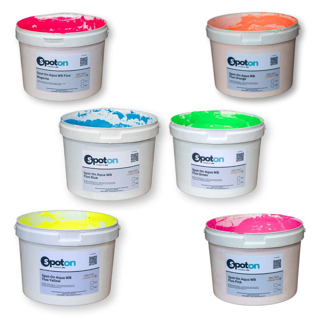 Spot-On Water Based colours are pre-mixed and ready to print inks in our popular and versatile hybrid base. This ink does not dry fast in the mesh and prints easily onto light or dark fabrics.