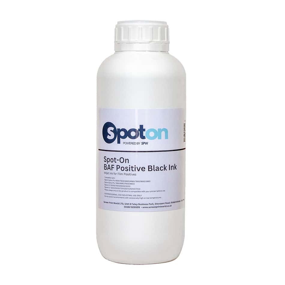 This product is an opaque dense black ink suitable for refilling inkjet ink cartridges for use on the most commonly used Inkjet Film Positive printers. Our Spot On BAF Ink will ensure you achieve a solid dense black film positive and ensure you achieve the best possible result from your screen exposures.